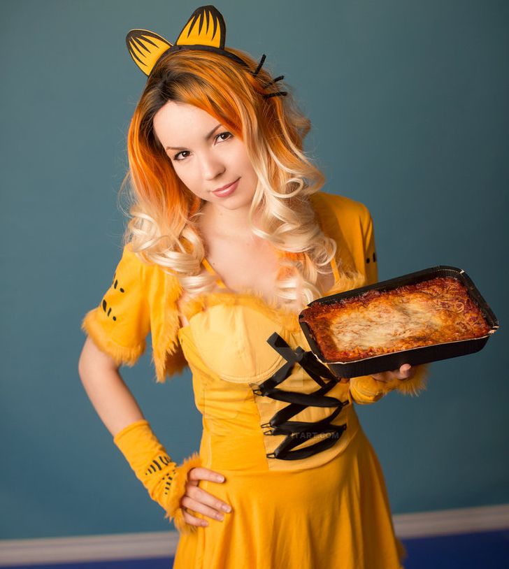 This woman goes for specific Garfield accents and tries to stay on the alluring side. She’s pretty, orange, and is totally hating Mondays. It completely works, she even has a lasagna.