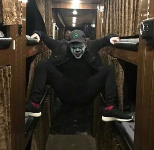 This photo shows the actor goofing around, wearing an all-black outfit and red sneakers as he hangs off some bunks and wears a baseball cap. Just as a cherry on top, Skarsgard makes the same creepy face that the character became known for.