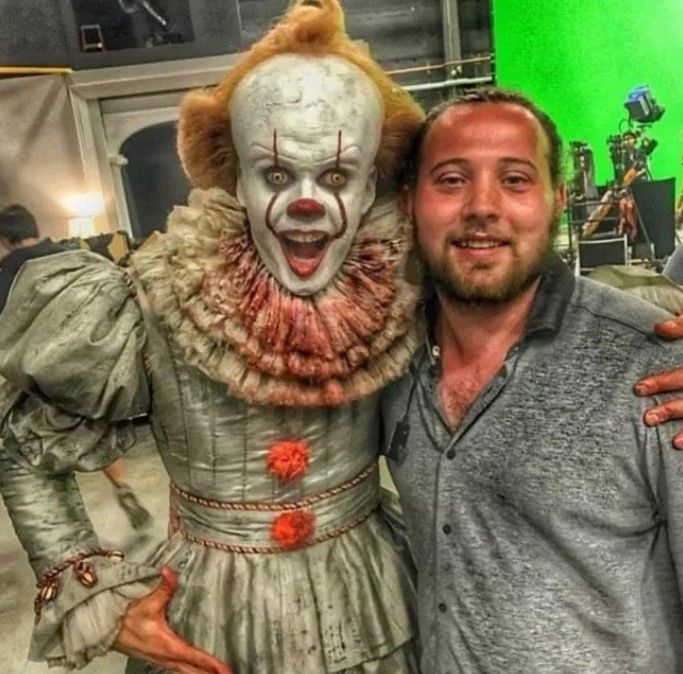 This photo was snapped behind the scenes, with a member of the film's production posing with a fully-clad Pennywise the Dancing Clown.