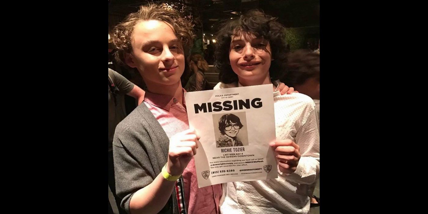 Of course, this only gives the creature more of an incentive to strike fear into the boy's heart. This photo shows Wolfhard and fellow Loser Wyatt Oleff holding up one of the prop missing posters for Tozier that appears in one of his dream sequences.