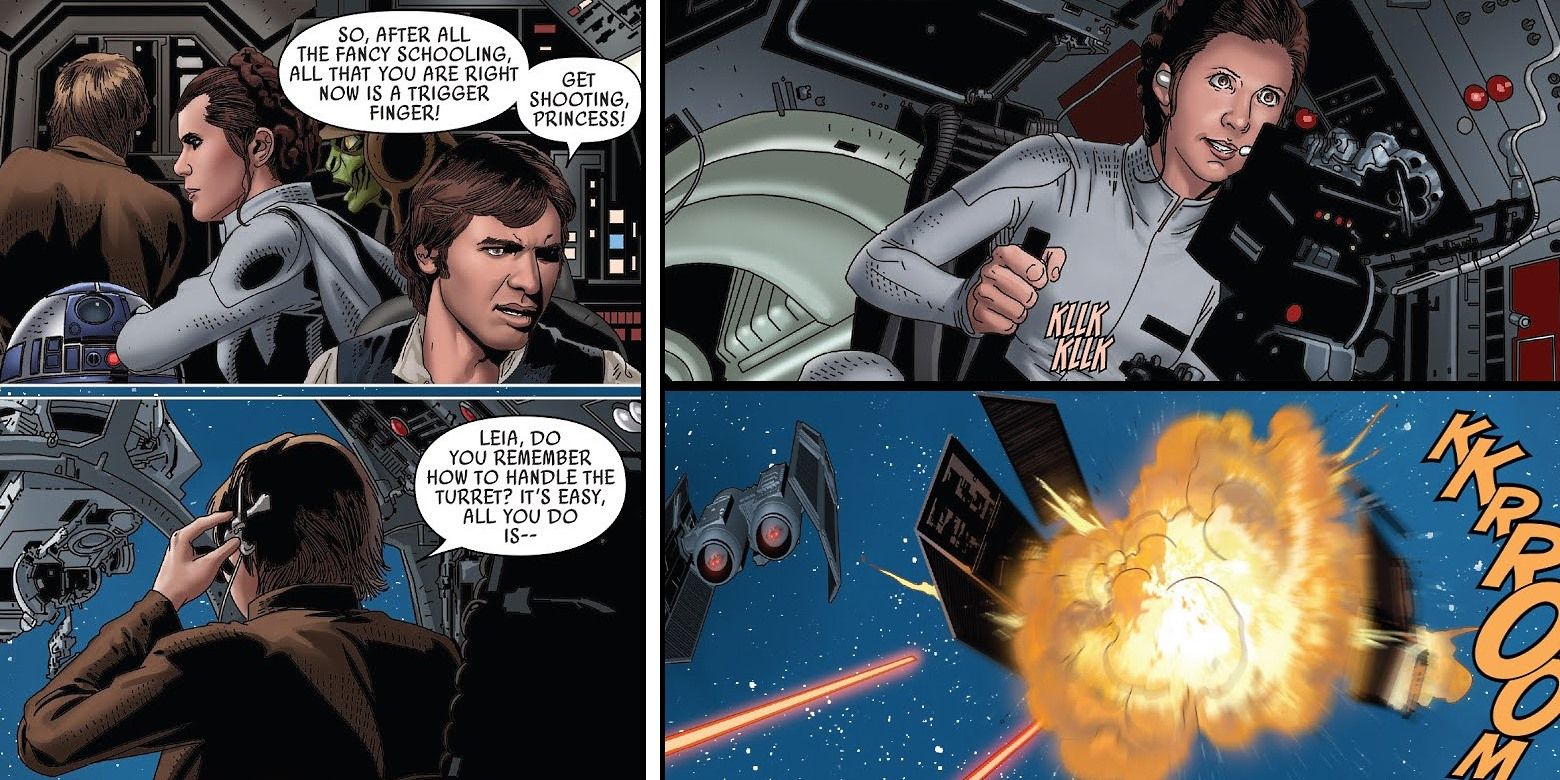 A belief that Leia Organa demonstrates personally, finally hopping onto the laser cannons on board the Millennium Falcon to show that her training as a “princess” also included blowing enemy ships into dust. And adding her name to the list of movie greats who manned the Falcon's weapons over its colorful history.