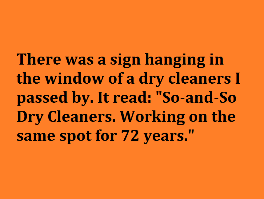 “There was a sign hanging in the window of a dry cleaners I passed by. It read: 'So-and-So Dry Cleaners. Working on the same spot for 72 years.'”